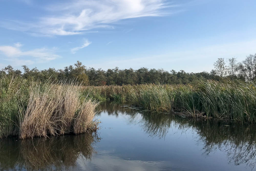 Nach knapp 900 m befindet sich auf der rechten Uferseite eine Umtragestelle, die wir nutzen. Der Holzsteg hier bietet sich gut für eine Pause an. Auf der anderen Seite der Umtragestelle ist der Wasserweg erstmal recht schmal, bevor sich ein kleiner See öffnet, der nur mit dem Kanu oder SUP erreichbar ist. Auf der gegenüberliegenden Seite vom See befindet sich eine schmale Durchfahrt, die wieder zurück zum Alde Wei führt. Hier geht es nach Links.